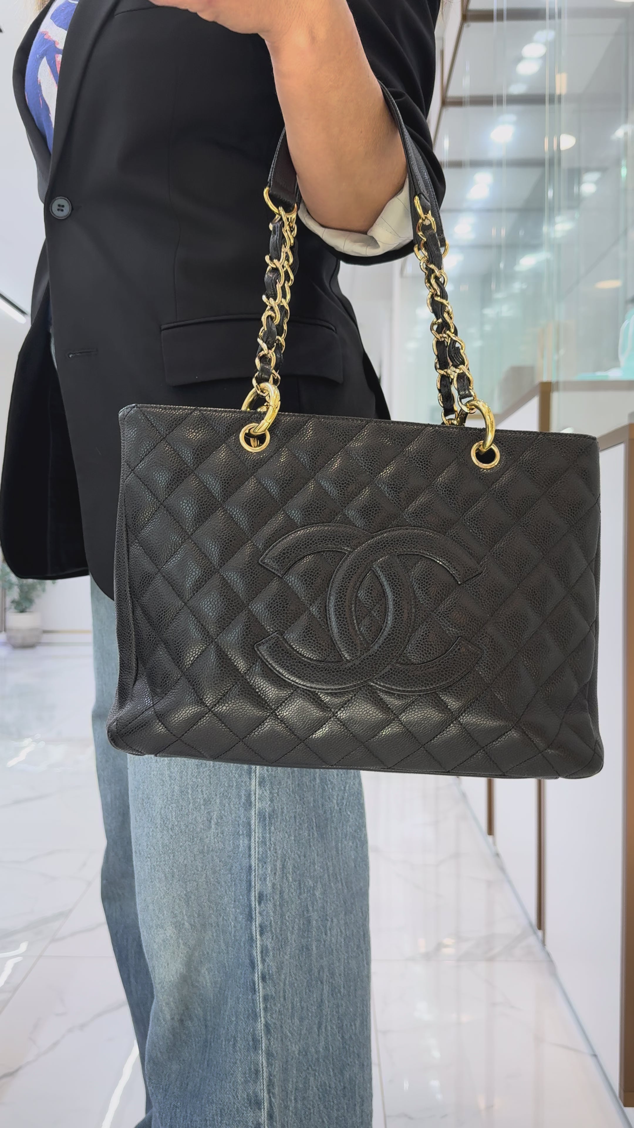Chanel Grand Shopping GST Black Caviar Quilted Pattern Leather Tote Handbag. Engraved with "Made in Italy". The "Chanel" trademark (or hallmark) can also be found on the item. In excellent condition.