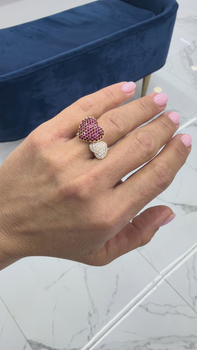 Leo Pizzo 18K Yellow Gold Amore Love Diamond Ruby Double Heart Cocktail Ring