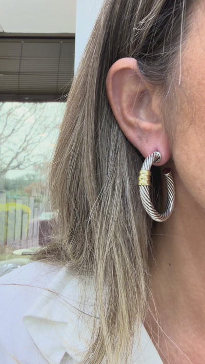 Vintage David Yurman 14K Yellow Gold 925 Silver Two-Tone Metro Hoop Earrings