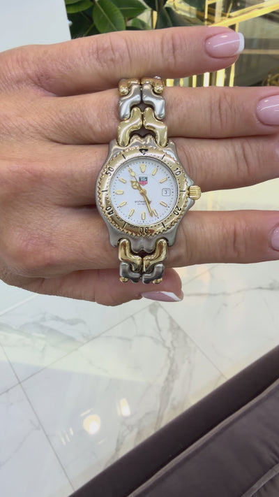 TAG HEUER Lady's, gold filled and stainless steel, TAG HEUER Swiss made wristwatch. Engraved with "St Steel". The "TAG HEUER" trademark (or hallmark) can also be found on the item. In excellent condition.