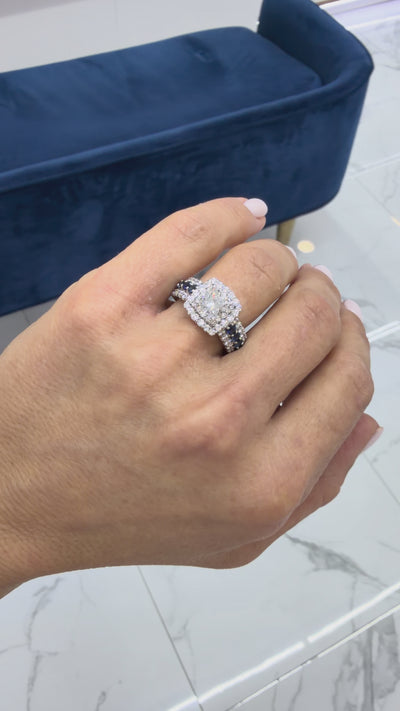 Ladies VERA WANG designer made polished rhodium plated 14K White Gold diamond and sapphire engagement, double-halo ring with a half round shank. Engraved with "14K". The "VERA WANG LOVE" trademark (or hallmark) can also be found on the item.