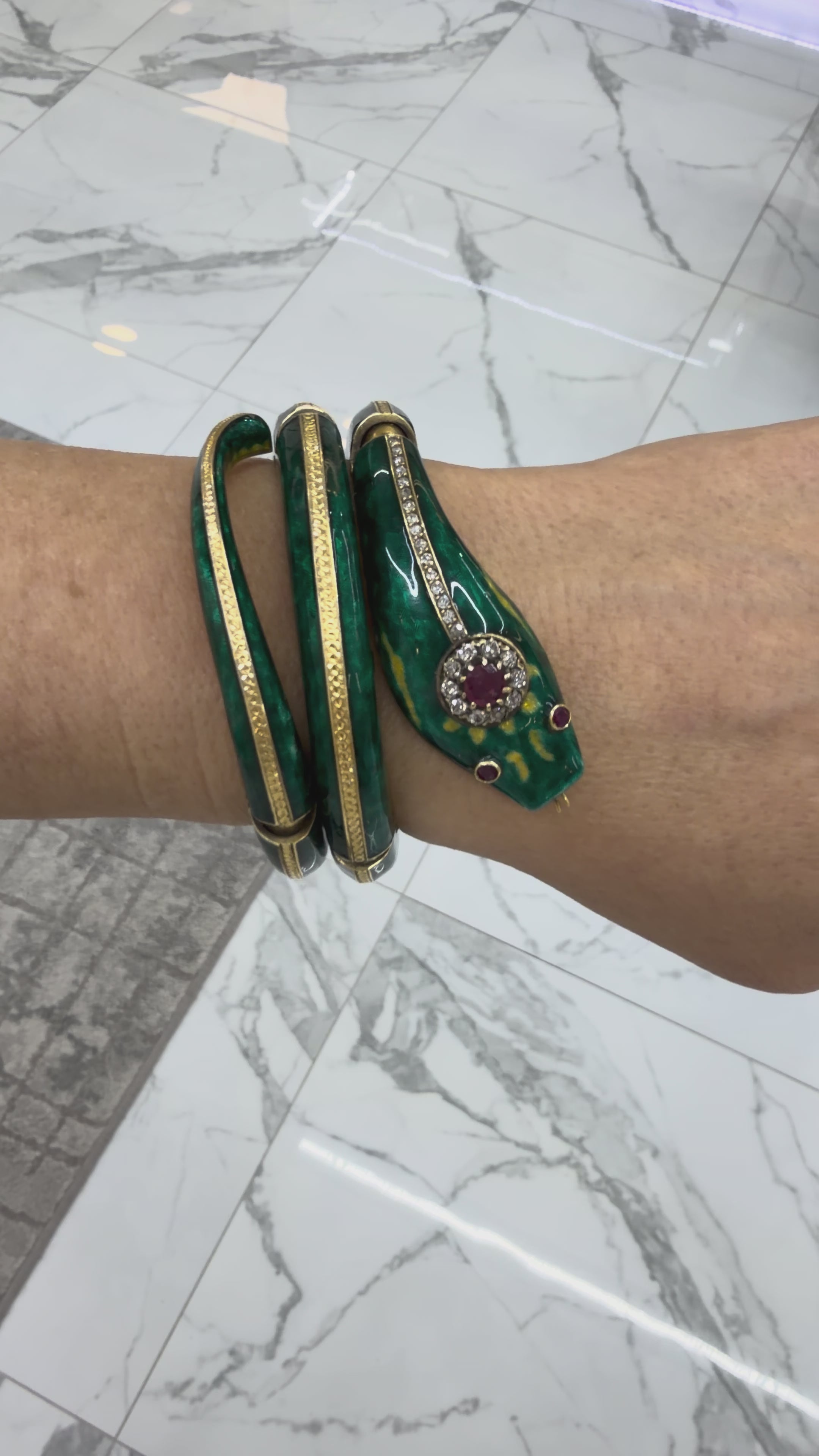 Vintage 18K Gold Old Diamond Ruby Green Enamel Snake Serpent Bangle Bracelet