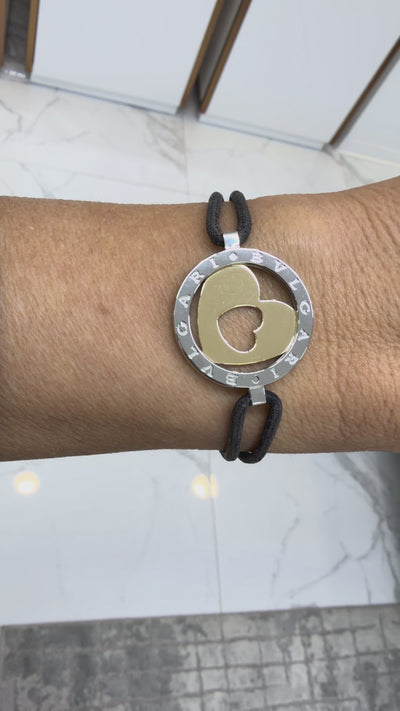 Bvlgari Tondo 18K Yellow Gold Steel Black Leather Two Tone Heart Bracelet
