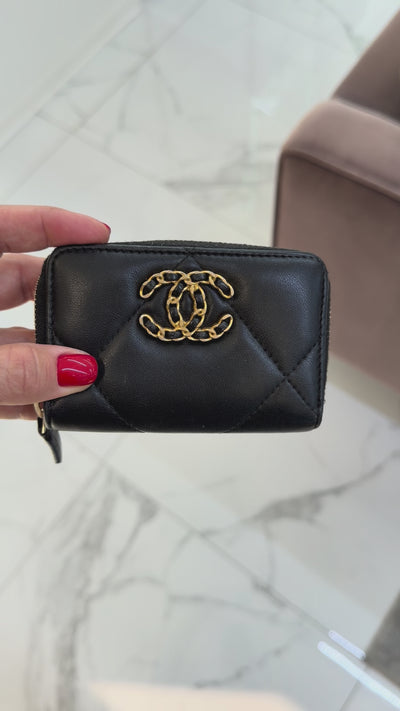 Chanel Lambskin Black Quilted Chanel 19 Zip Around Coin Purse Wallet Bag. Engraved with "Made In Italy". The "CHANEL" trademark (or hallmark) can also be found on the item. In excellent condition.