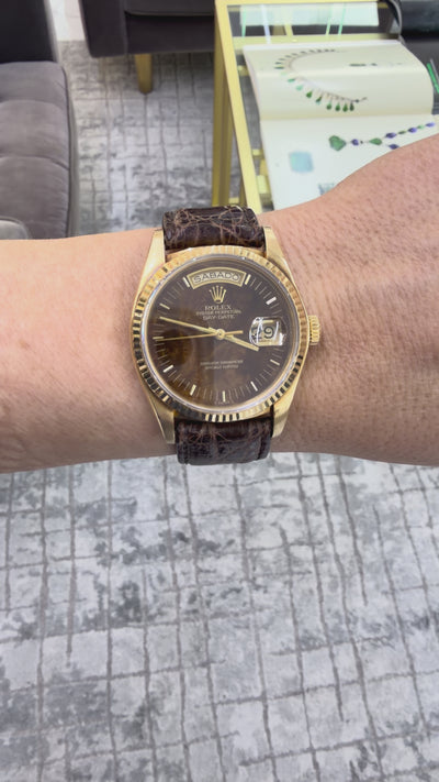 Vintage Rolex Day Date 36MM 18038 Spanish Wood Dial Brown Leather 18K Gold Watch