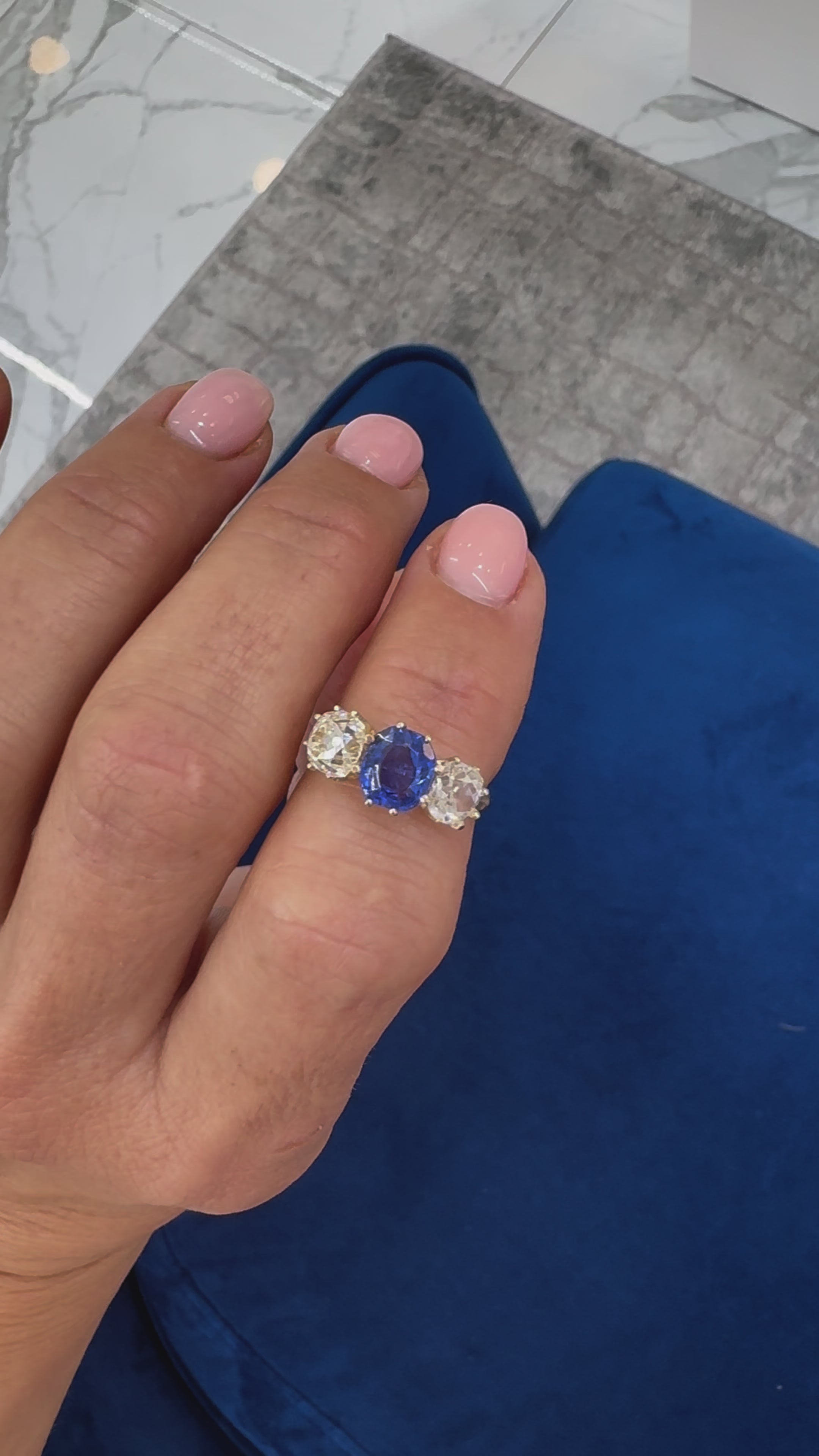 Antique 14K Yellow Gold Oval Burma Sapphire Three Stone Diamond Cocktail Ring