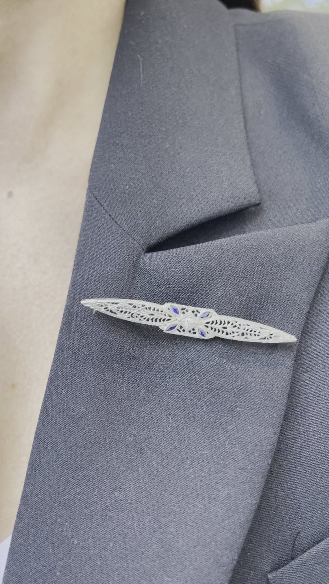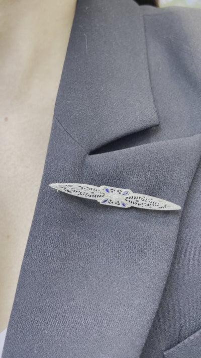 Filigreed 14K white gold diamond and sapphire antique art-deco brooch. Engraved with "14K".