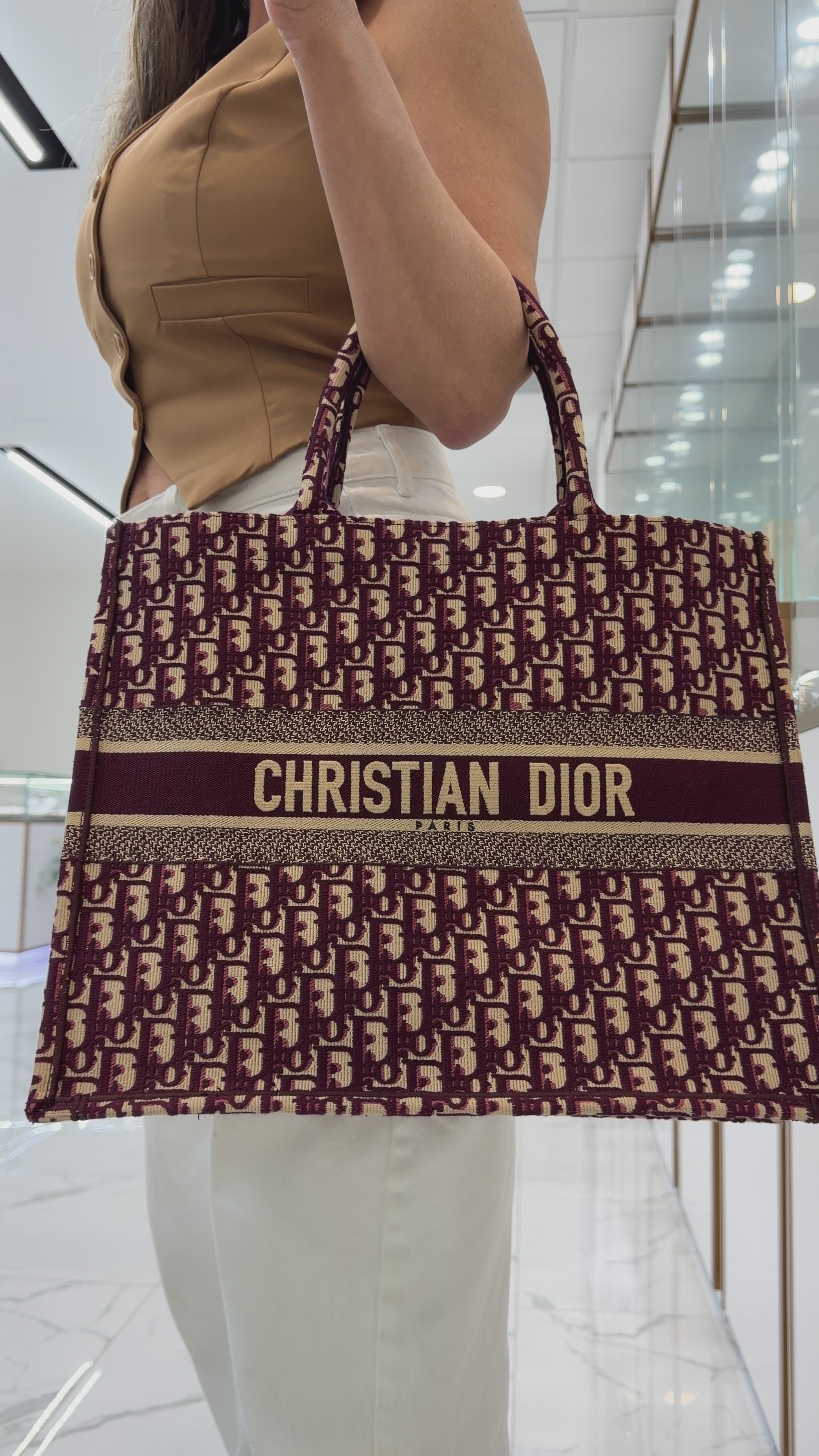 Christian Dior Book Medium Oblique Embroidery Burgundy Canvas Tote Bag