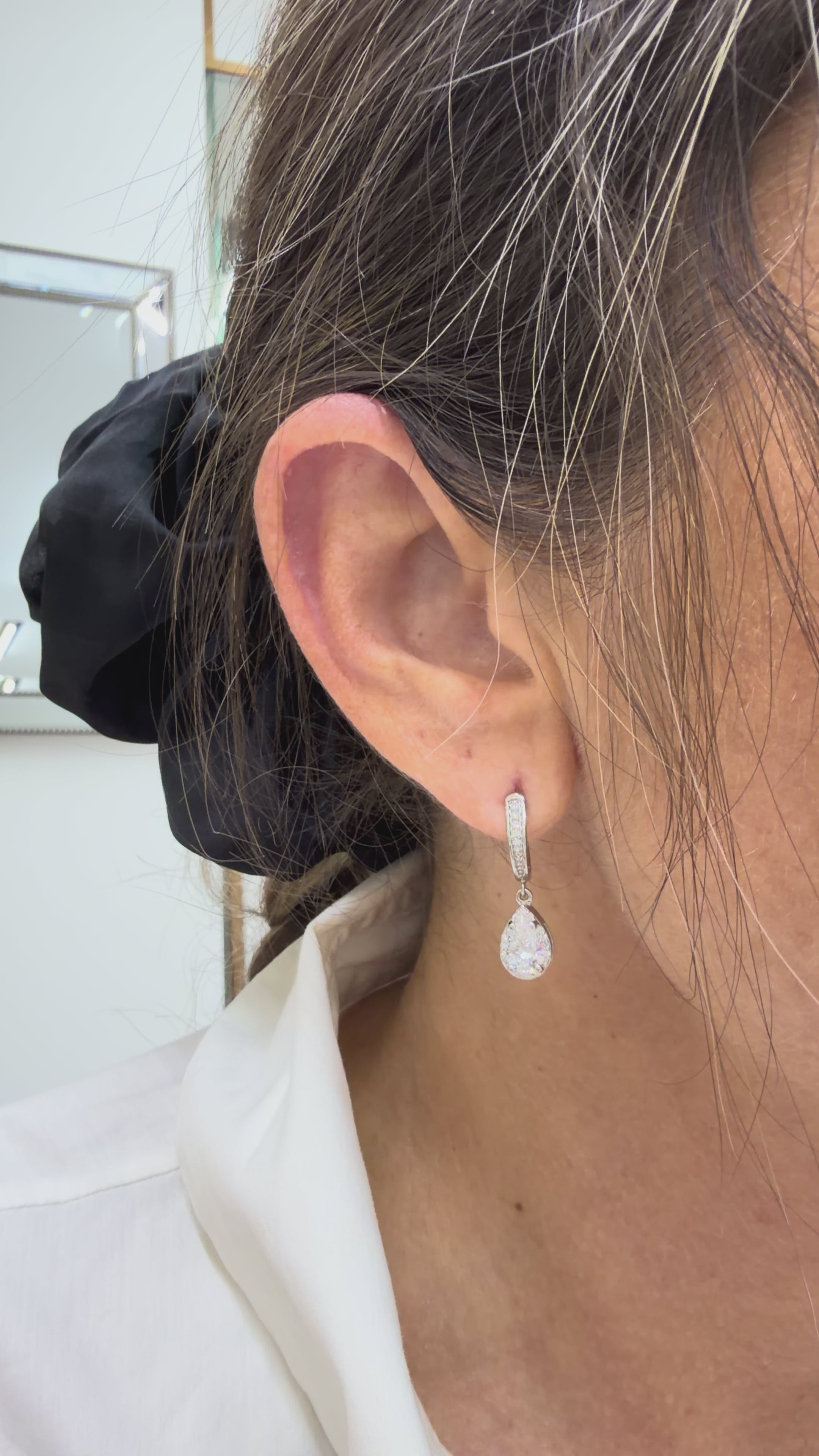 One pair of ladies rhodium plated 14K white gold, diamond dangle, drop, hoop, halo earrings with "earring lock" post/back system. In excellent condition.