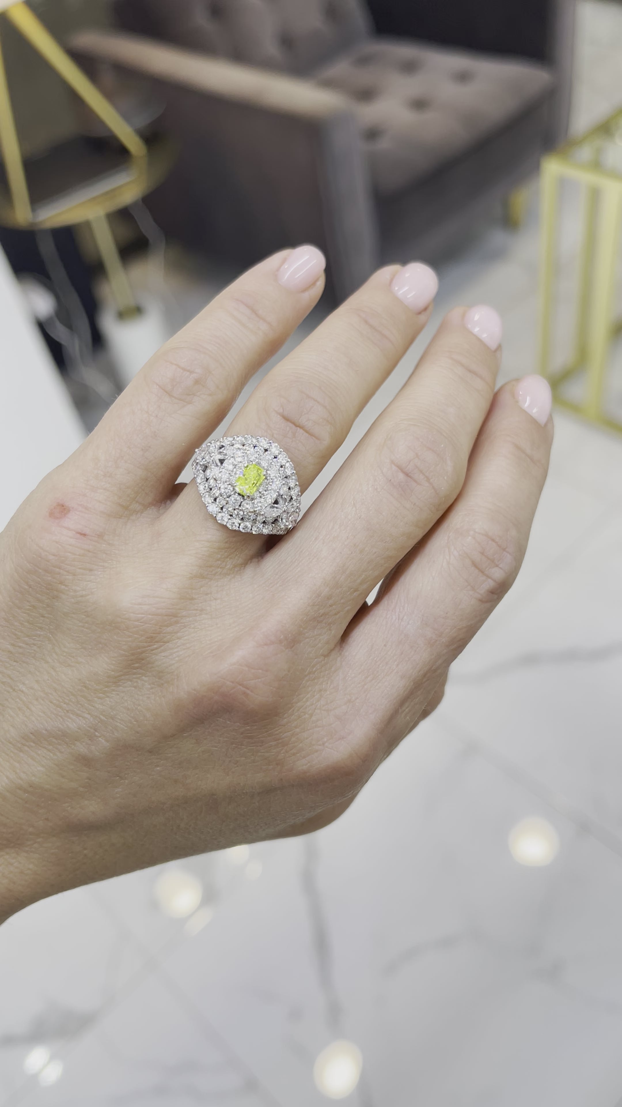 18K white gold diamond cocktail ring with a certified fancy vivid green-yellow diamond with a tapering shank.