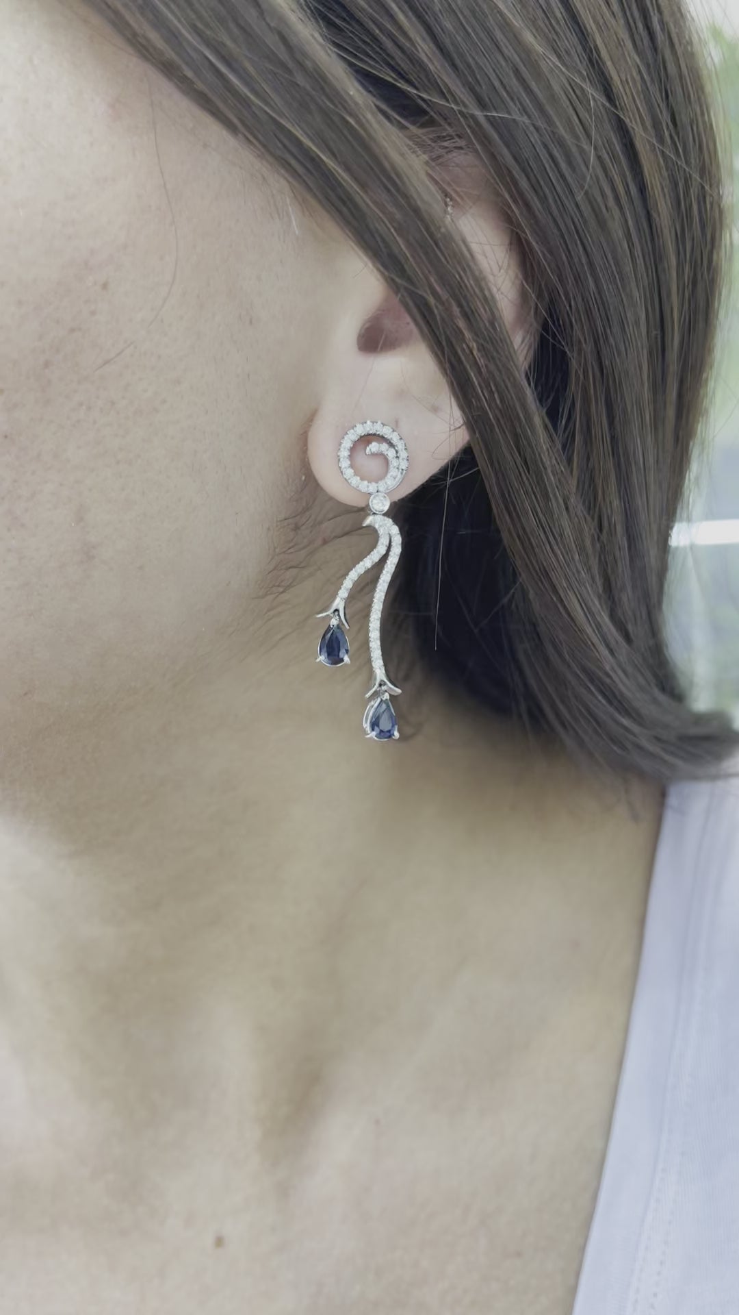 Ladies 18K White Gold Sapphire Diamond Dangle Drop Earrings