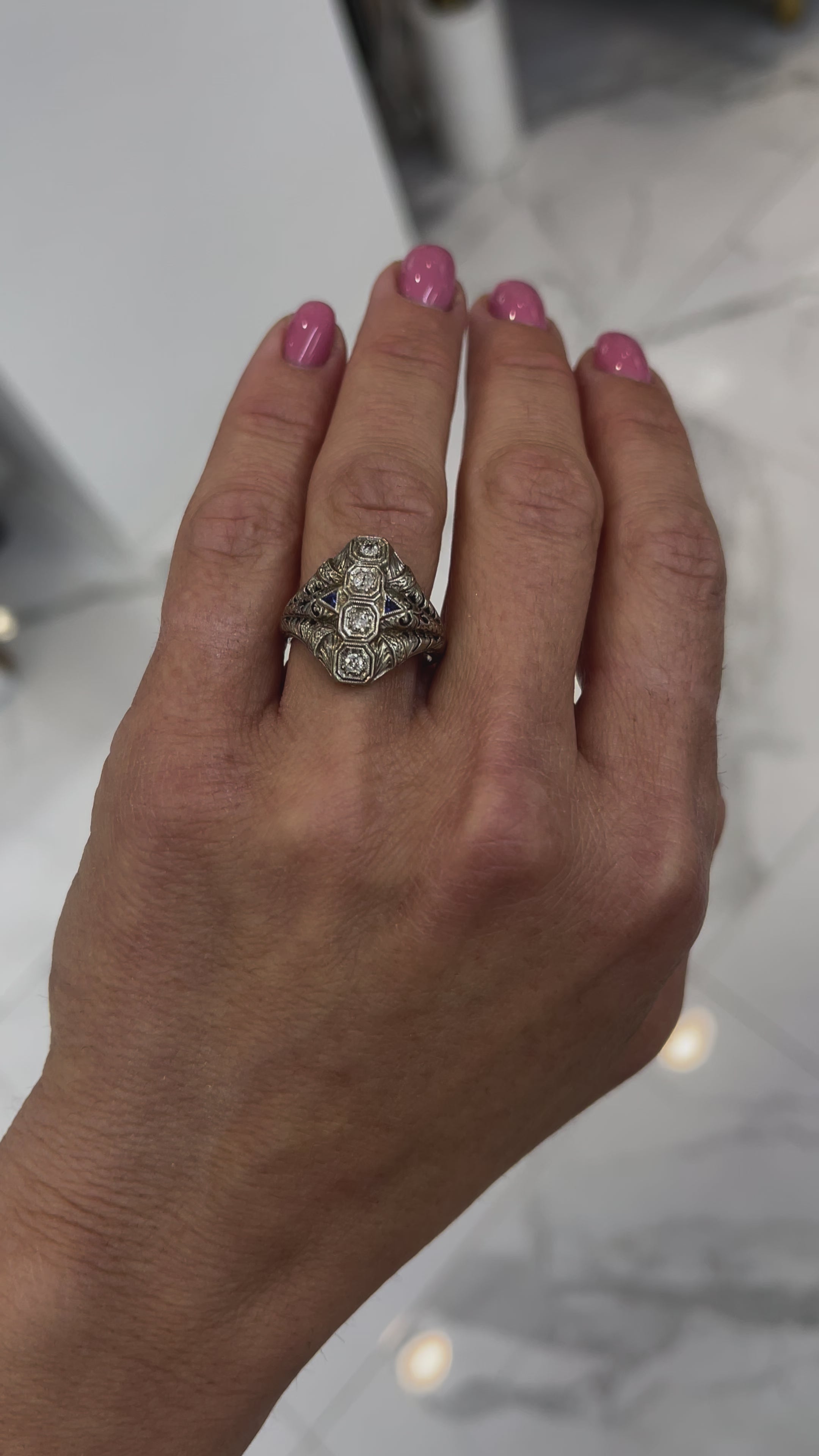 Antique Art Deco Filigreed 18K White Gold Four Diamond Sapphire Cocktail Ring