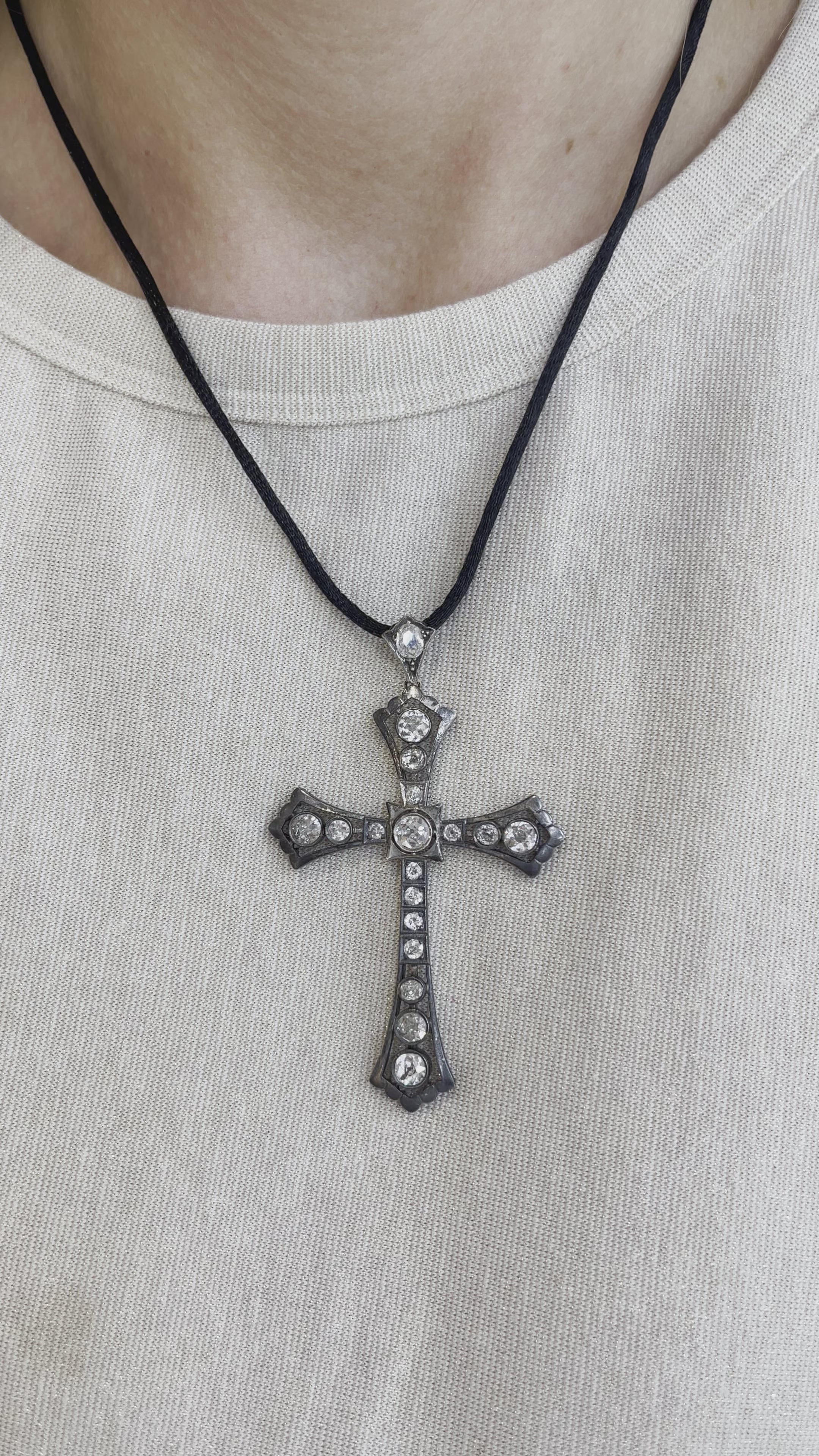Ladies Victorian Antique Sterling Silver Old Cuts Diamond Cross Pendant Black Rope Necklace