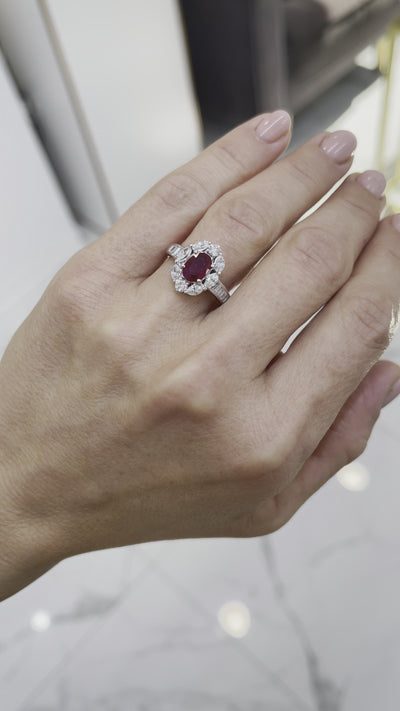 Ladies Vintage 18K White Gold 1.04ct. Gia Oval Ruby Halo Marquee Diamond Cocktail Ring