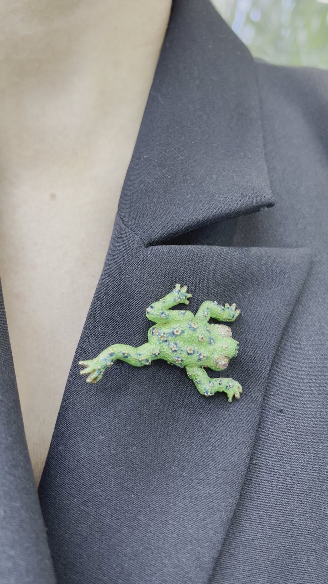 Merrin Vintage 18K Yellow Gold Ruby & Diamond Frog Enamel Brooch / Pin