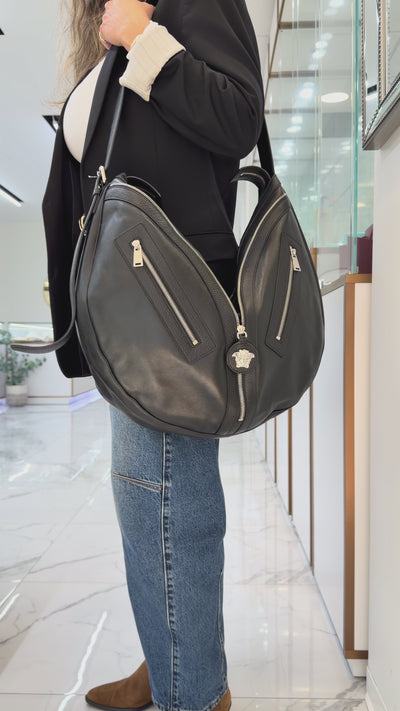 Versace Repeat Large Hobo Black Leather Silver Hardware Shoulder Bag
